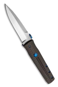 Zeer mooi en sierlijke gelijnde dolk in klassieke vorm, met moderne materialen uitgevoerd! Het heft is gemaakt van echt Carbon Fiber (CF). Voor de rest is dit mes voorzien van een blauw geanodiseerde kast. Met een blauwe titanium pocketclip en sierkogel aan de bovenkant van het heft.